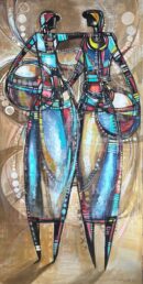 Description: Beauties & Dreams is a striking portrayal of companionship and shared aspirations. Two stylized figures stand side-by-side, their forms defined by intricate geometric patterns, rhythmic dots, and bold black outlines that characterize Olukayode Ojo’s contemporary abstract style.